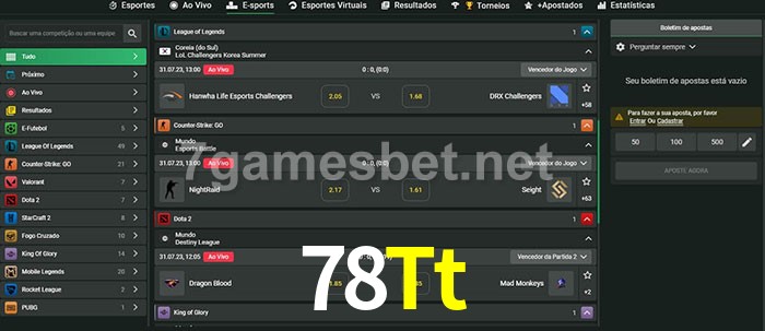 O 78Tt oferece uma grande seleção de opções de apostas em e-sports com probabilidades competitivas